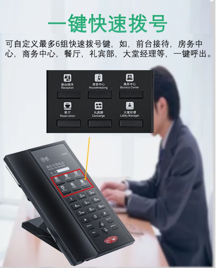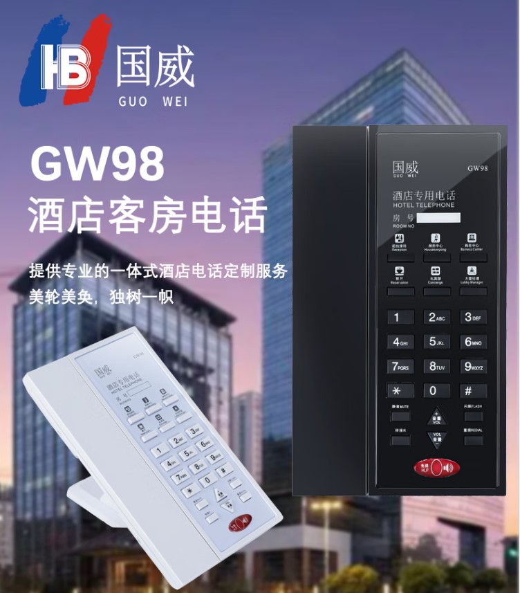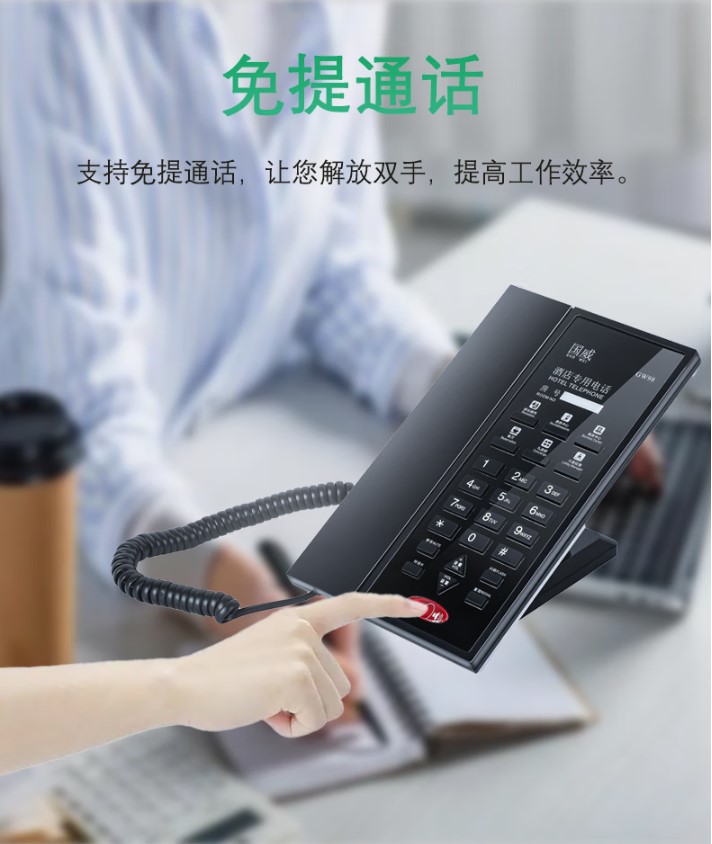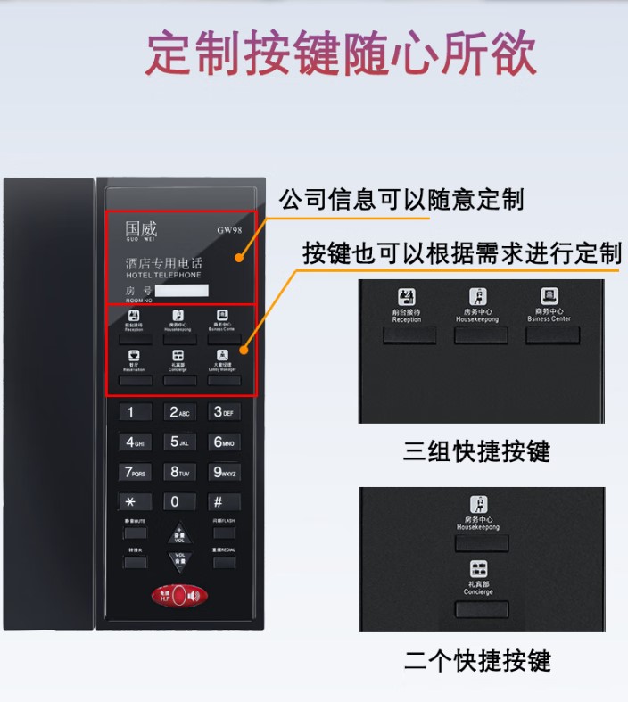 1:國威GW98酒店專用話機(jī)采用主機(jī)與通話手柄融合在一個(gè)平面設(shè)計(jì)架構(gòu)、30°斜面撥號鍵盤、嵌入式可拆卸底座酒店專用電話機(jī);壁掛孔≥2、RJ9接口≥2、RJ11≥2(可串聯(lián)酒店衛(wèi)生間分機(jī)或者傳真等)、酒店自編輯快捷按鍵≥6、酒店房號顯示欄≥1、鍵盤主叫撥號區(qū)按鍵≥12;具備免提、重?fù)?、靜音、轉(zhuǎn)接、閃斷、音量+、音量-、客房一鍵呼叫酒店前臺(tái)等物理按鍵